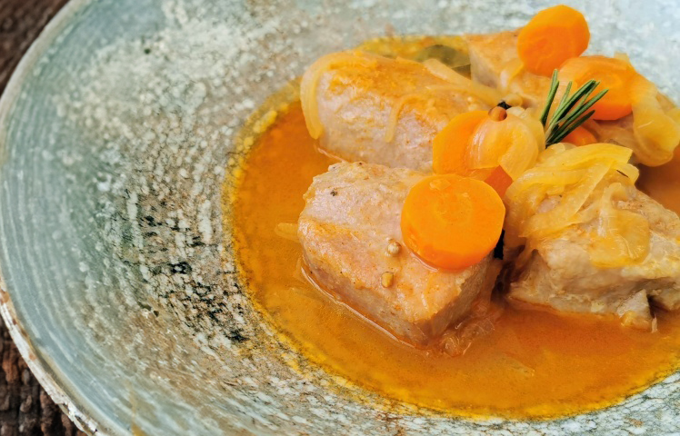 Cochino confitado en pasta brik, papas, queso y verduras. Salsa de boletus.